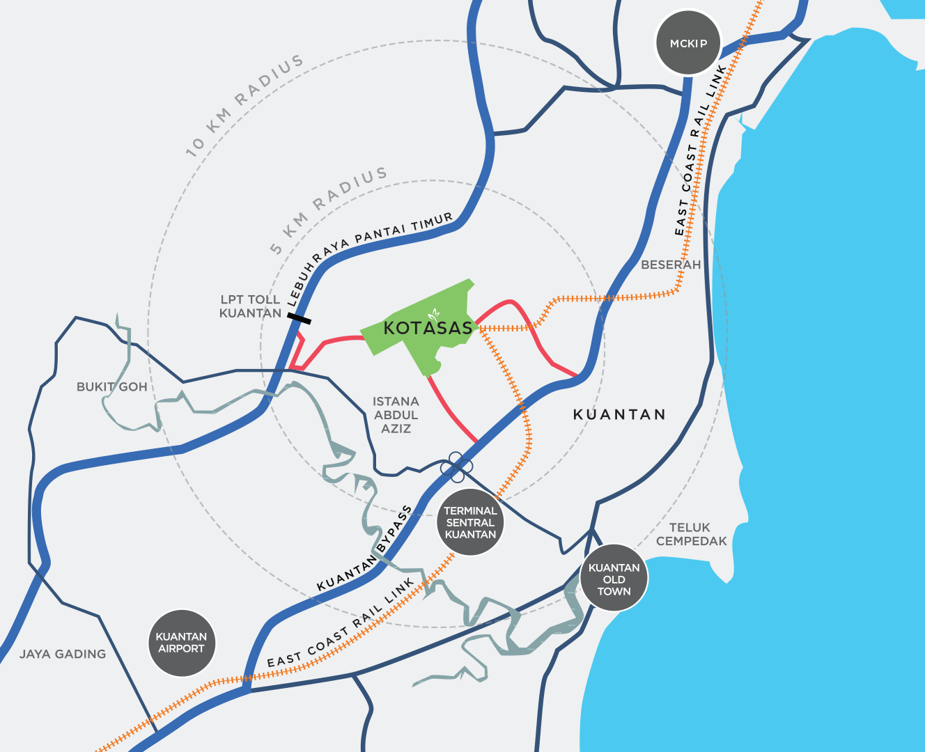 KotaSAS Central will be the main ECRL station in Kuantan town. Connecting Port Klang in the west coast, through KotaSAS and northwards to Kota Bahru, this high speed railway link will carry both passengers and freight from west to east and vice versa. We anticipate its operations by 2026 where we welcome a new generation of dynamic growth in KotaSAS and Kuantan.